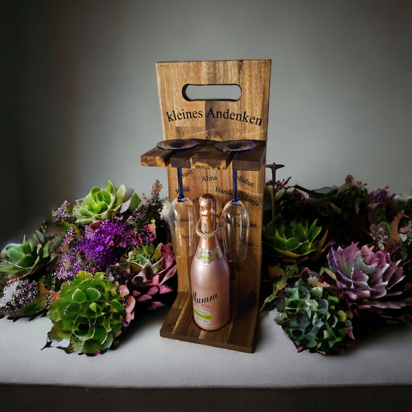 Personalisierter Wein/ Sektflaschenhalter mit 2 Gläsern uns massiven Holz.